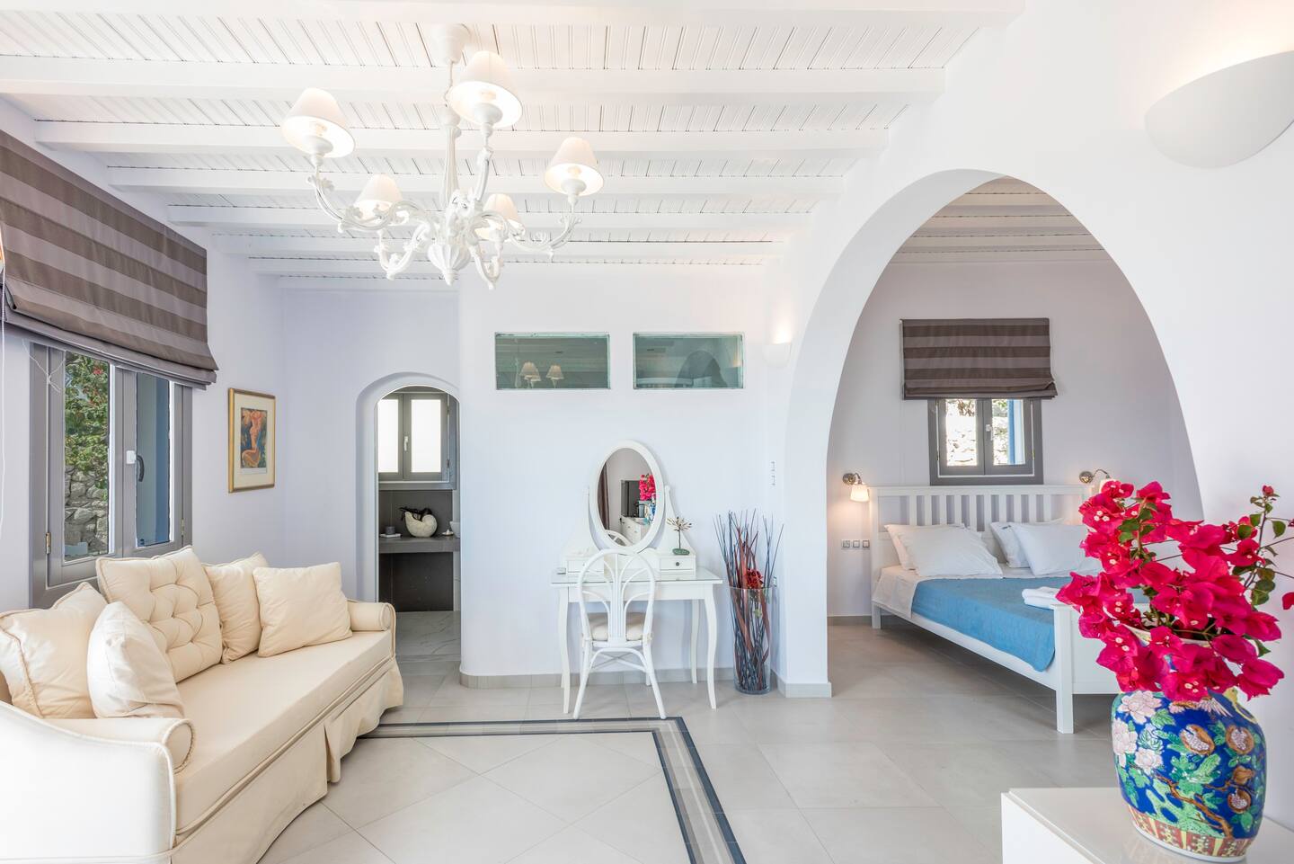 The Poseidon Method Mykonos main residential property (Poseidon’s Palace) can accommodate up to 8 patients at a time and is staffed 24/7 by our treatment personnel. Poseidon’s Palace sits at the very top of Mykonos’s highest mountain and is well hidden from the winds due to its architectural layout. The property combines the charm and the elegance of the interiors with the magnificent panoramic sea view of the terrace.